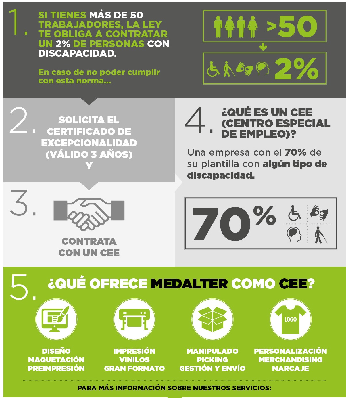 Ley General de Discapacidad (antigua LISMI - Leys de Integración Social de los Minusválidos) establece que todas las empresas públicas y privadas españolas cuya plantilla (cómputo total de empleados independientemente del tipo de contratación) sea de 50 o más trabajadores, deben tener una cuota de reserva a favor de las personas con una discapacidad igual o superior al 33 % correspondiente al 2% de la plantilla. Esta ley pretende, entre otros objetivos, impulsar y fomentar la integración laboral de personas con discapacida.